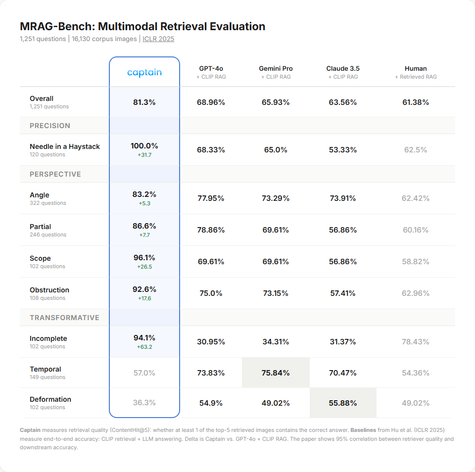 On MRAG-Bench (ICLR 2025), a standardized academic benchmark for vision-centric retrieval with 16,130 images and 1,251 questions, Captain achieves 81.3% retrieval accuracy—outperforming every end-to-end RAG system tested in the paper, including GPT-4o with CLIP retrieval (68.96%). Full results, methodology, and evaluation code are available in our open-source evaluation repository.